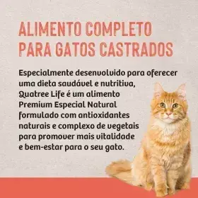 A Ração Quatree Life Gatos Castrados Salmão e Arroz é uma opção Premium Especial Natural desenvolvida para atender às necessidades específicas de gatos castrados. Sua fórmula equilibrada conta com ingredientes naturais, livre de transgênicos, corantes, aromatizantes e conservantes artificiais. Enriquecida com um complexo de vegetais como brócolis, beterraba branca, batata-doce e cenoura, oferece fibras, vitaminas e minerais essenciais, promovendo saciedade, energia e vitalidade de forma saudável.